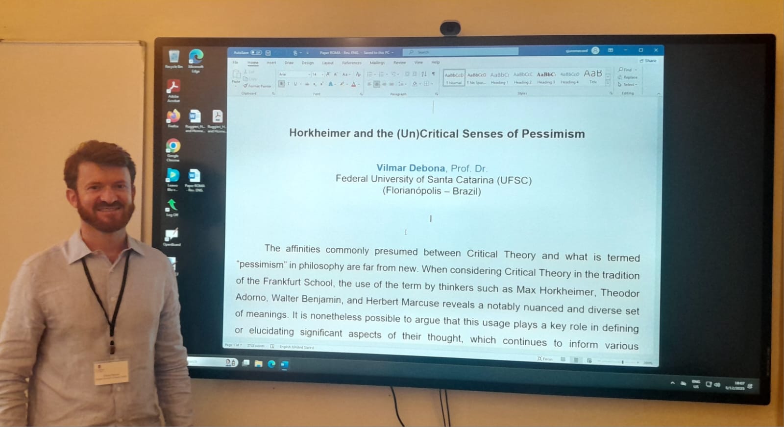 O professor Vilmar Debona, docente do PPGFil-UFSC, participou da 17th International Critical Theory Conference in Rome, que ocorreu entre os dias 12 a 14 de maio de 2025, na St. John’s University (Campus Roma). Juntamente com o Prof. Davide Ruggieri (Università di Padova), ele co-organizou um painel sobre a categoria de “pessimismo crítico” no âmbito da teoria crítica, e apresentou o trabalho “Horkheimer and the (Un)Critical Senses of Pessimism”.